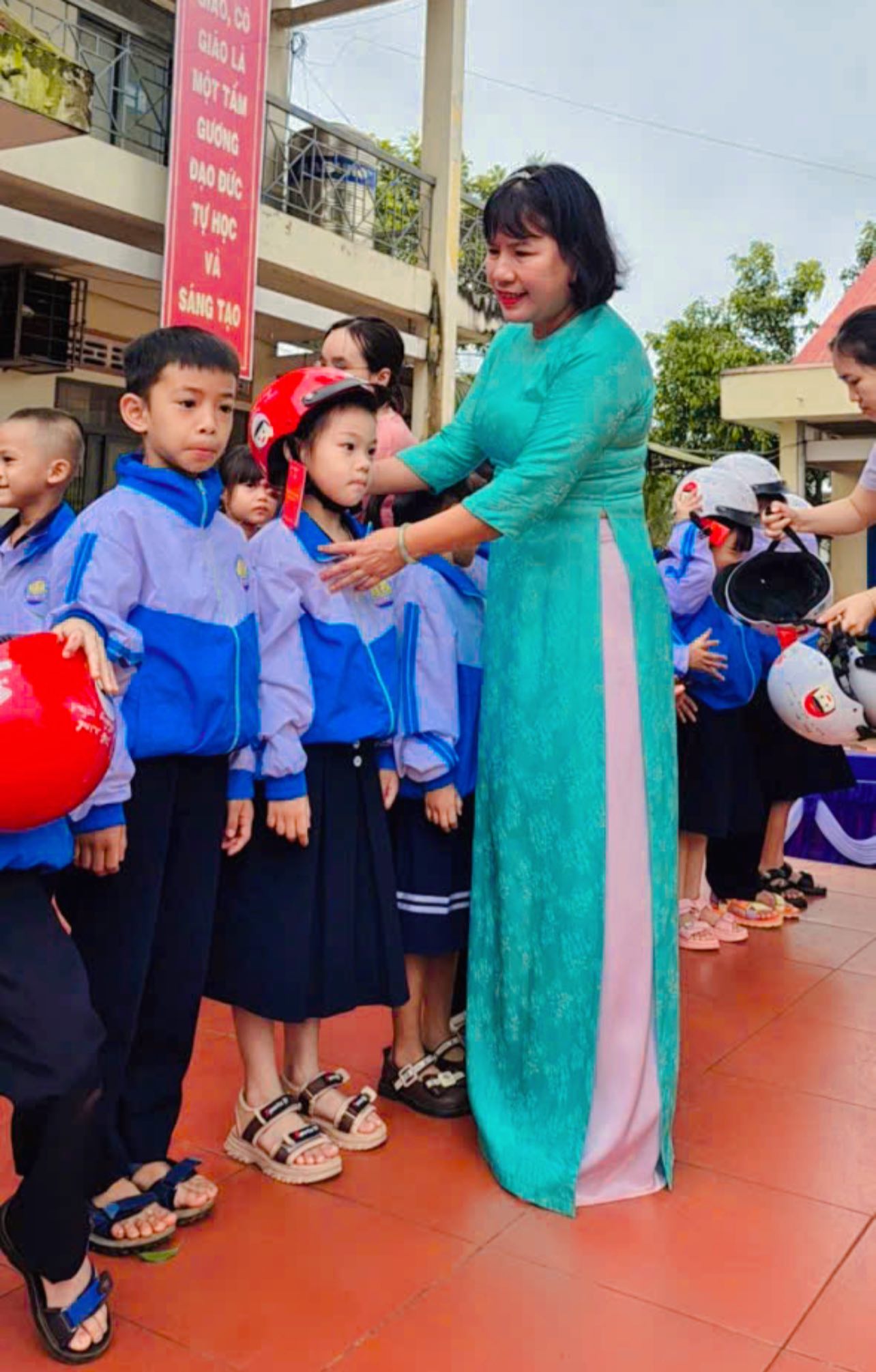 Hon đa Trung Thạch trao mũ cho học sinh lớp 1 trường Tiểu học Nguyễn Trãi